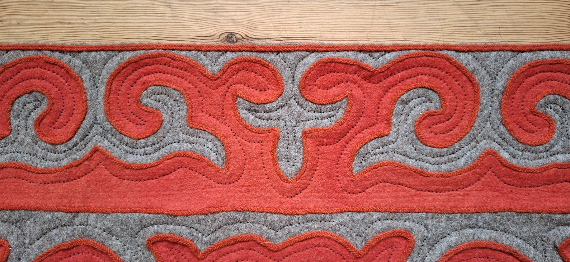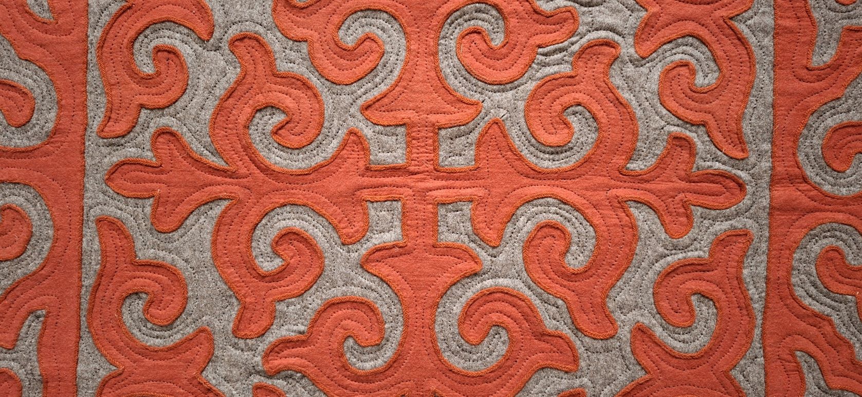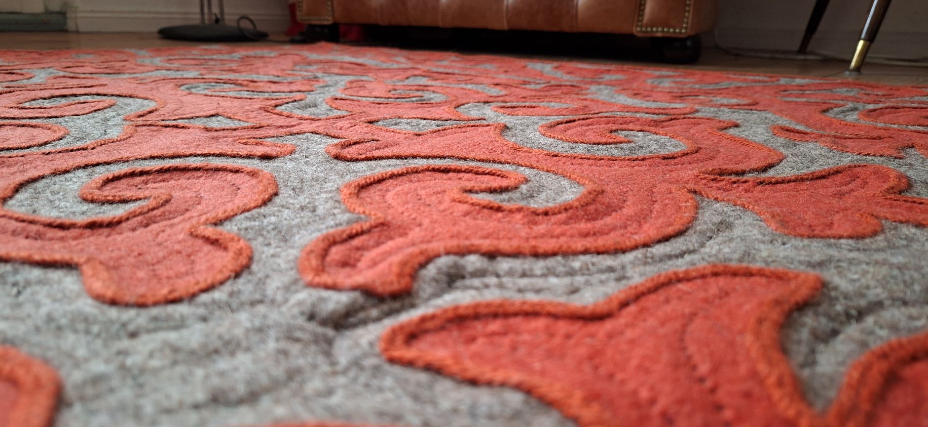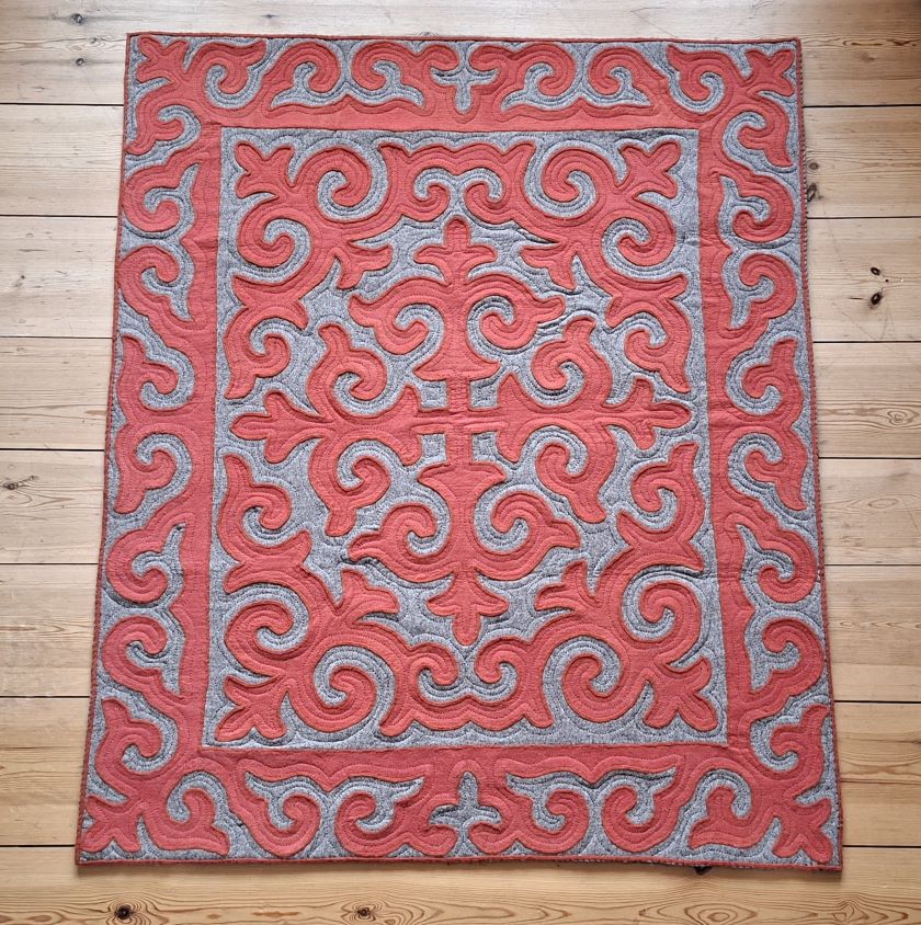 Shyrdak in Terrakotta mit grauem Muster, ca. 124 x 149 cm, handgearbeitet, 100% Wolle, Stärke ca. 1cm