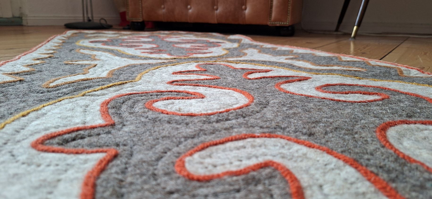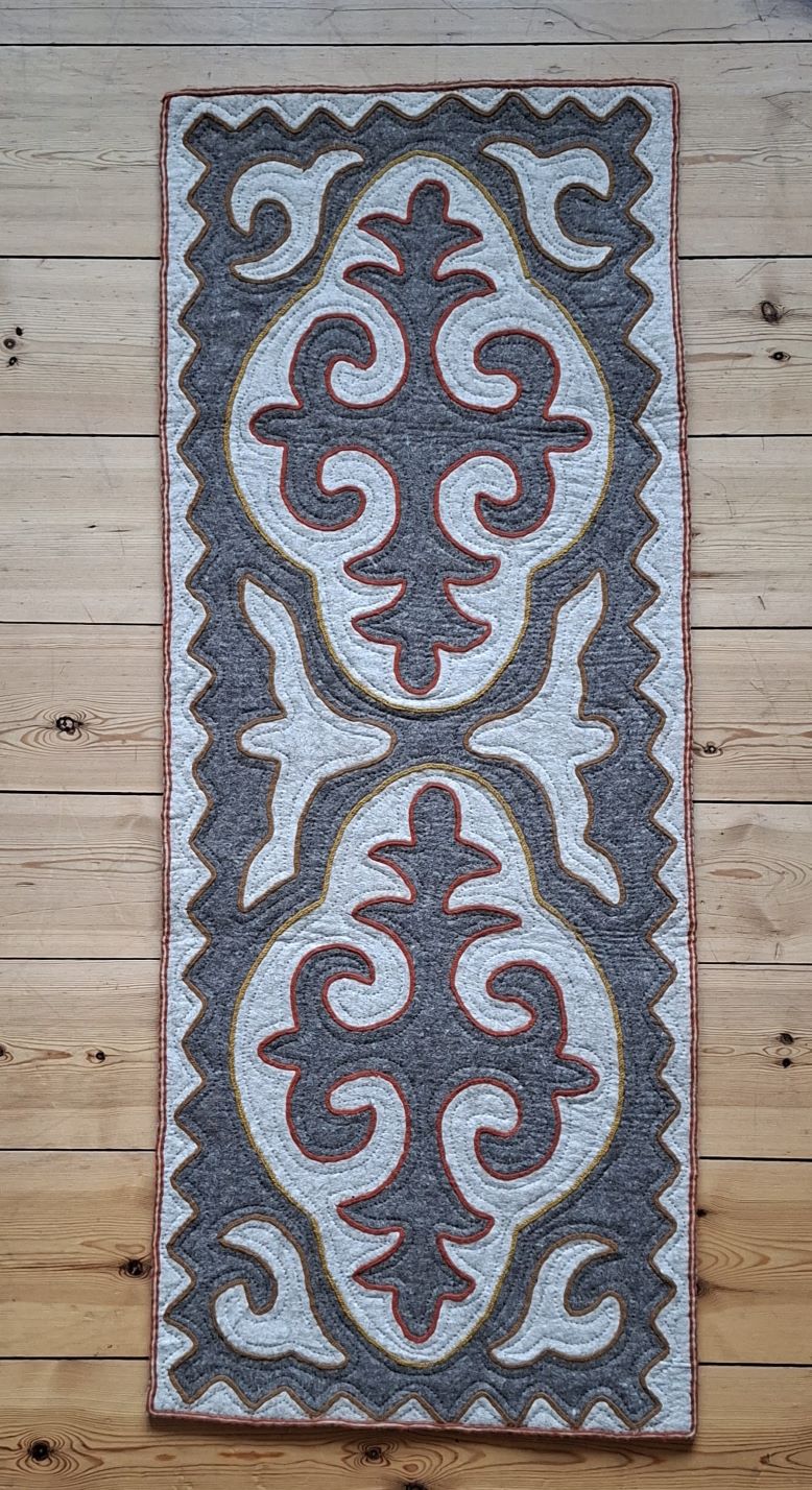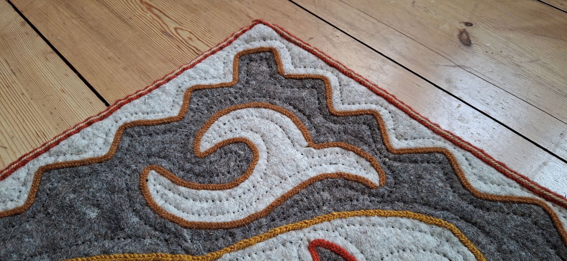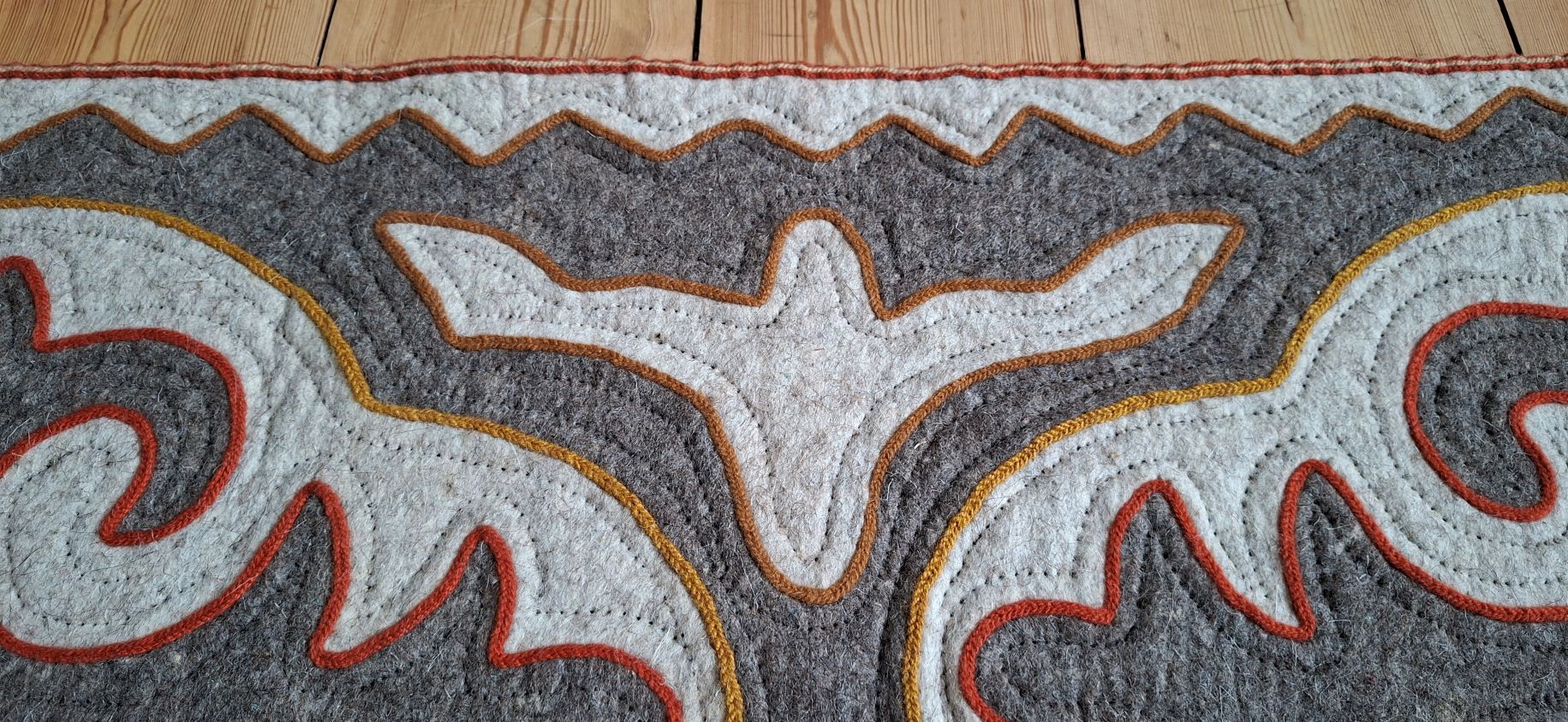 Shyrdak beige clair, marron foncé avec bordure bicolore n/b (Jeek), environ 227 x 152 cm, fait main, 100 % laine, épaisseur env.
