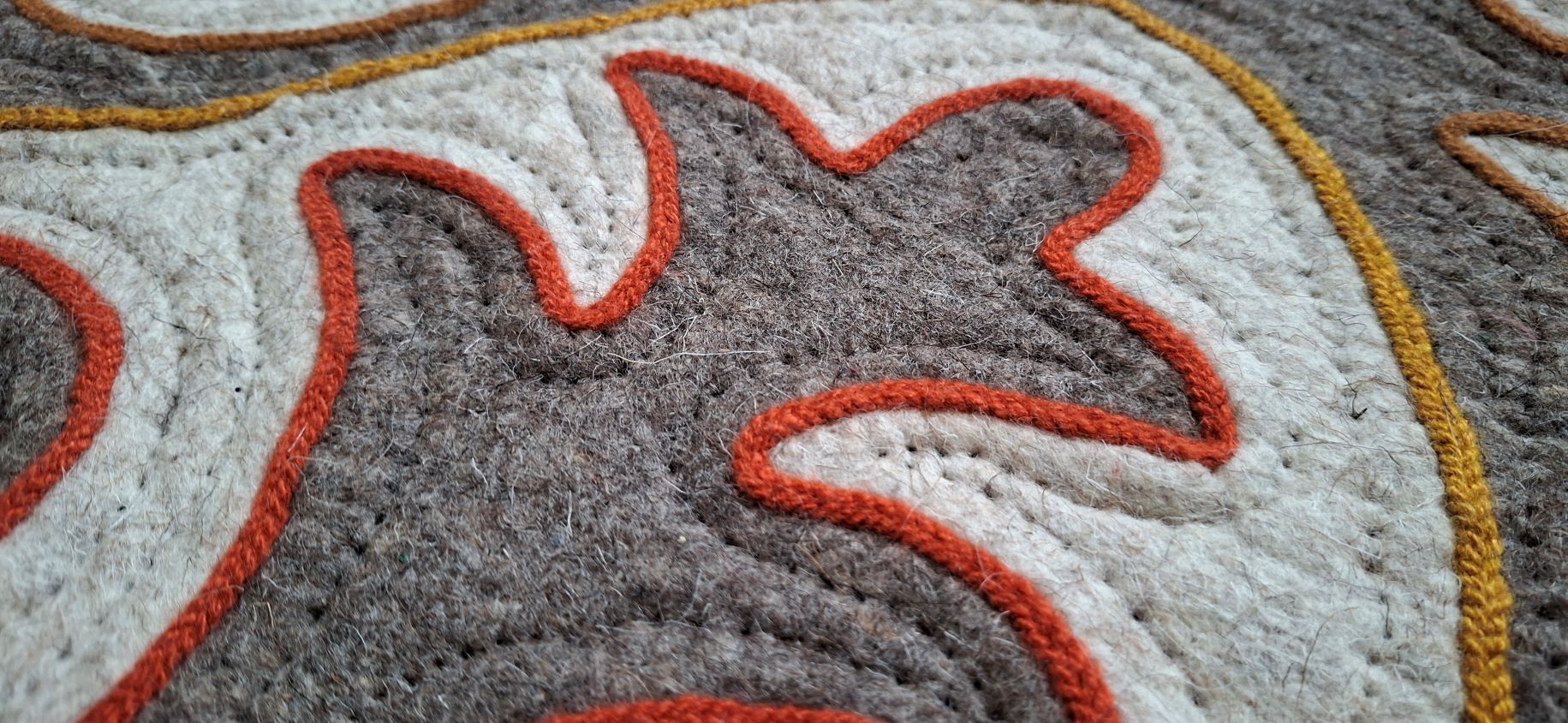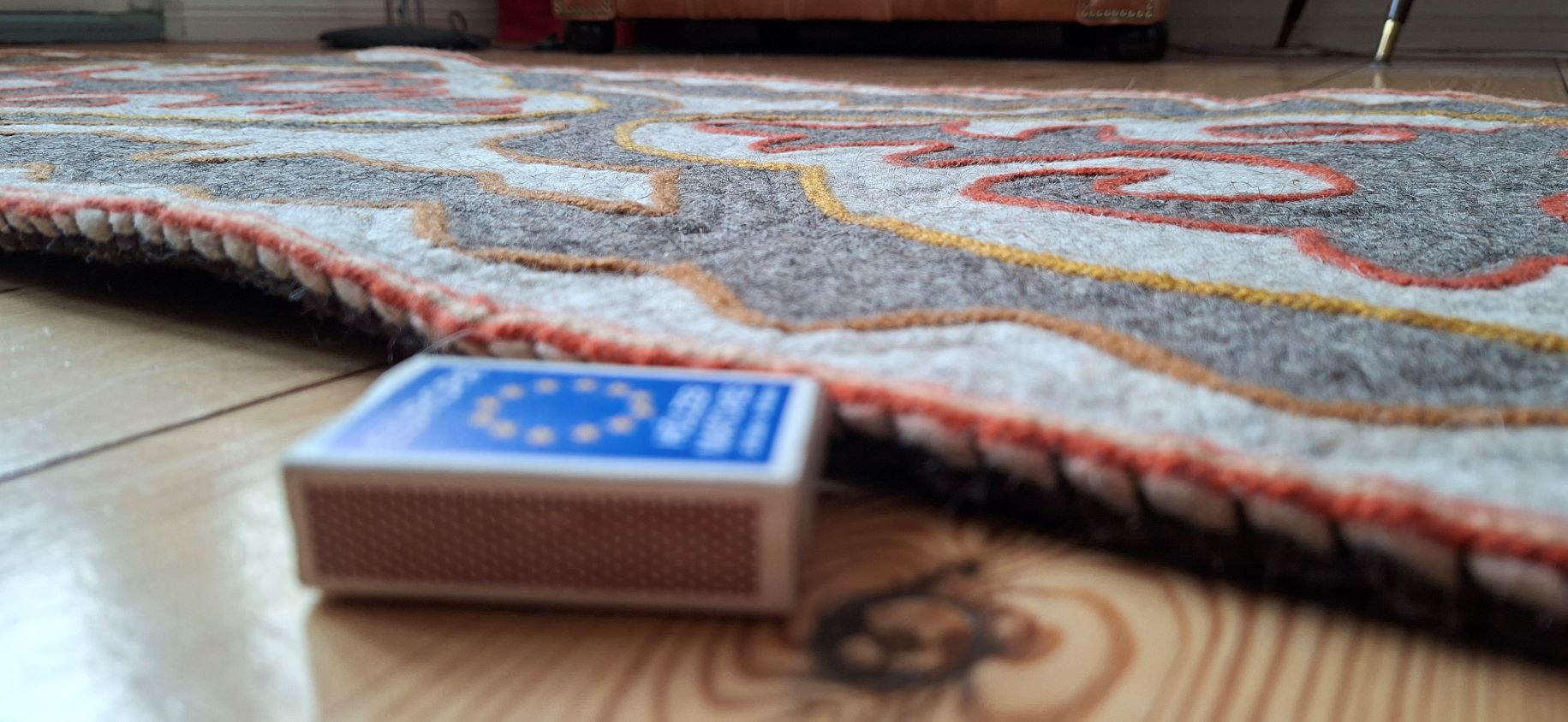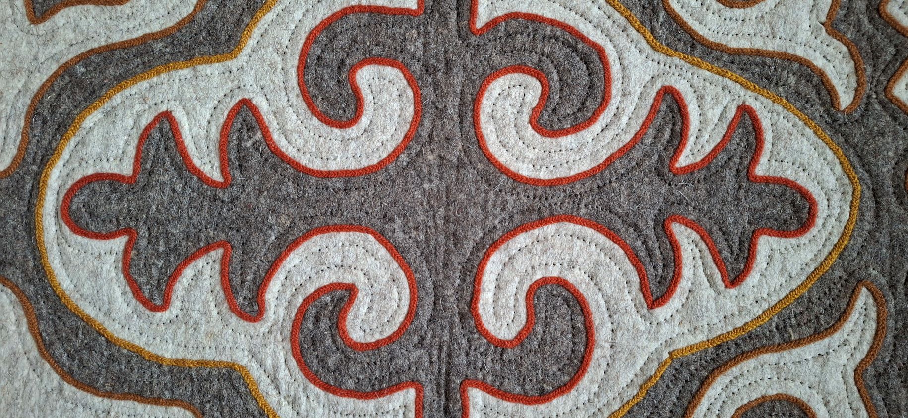 Shyrdak beige clair, marron foncé avec bordure bicolore n/b (Jeek), environ 227 x 152 cm, fait main, 100 % laine, épaisseur env.